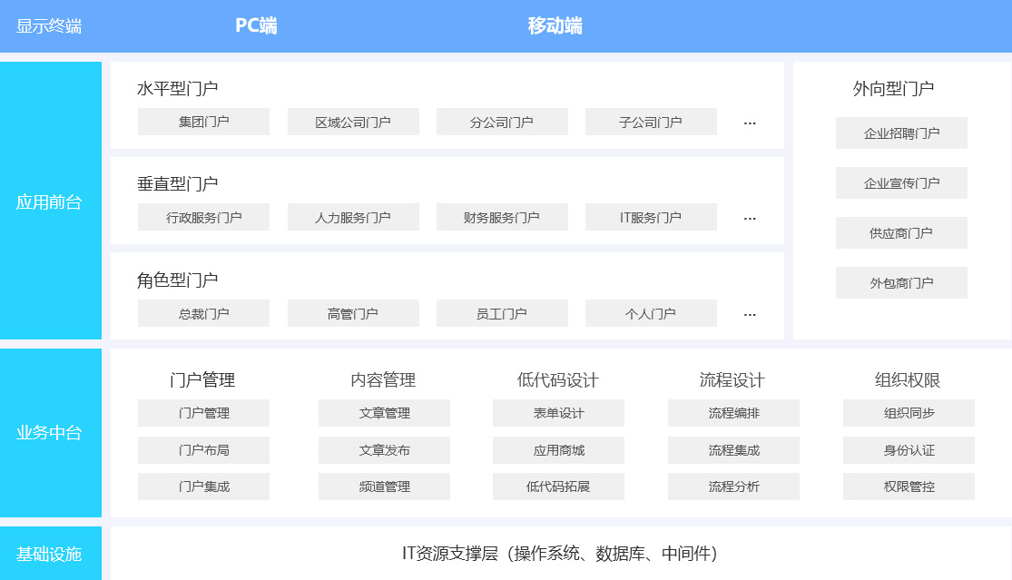 基于“集中统一、加强协同”理念,帮助企业搭建数字化门户,聚合务类应用,为企业提供统一应用入口、身份认证、可视化搭建。